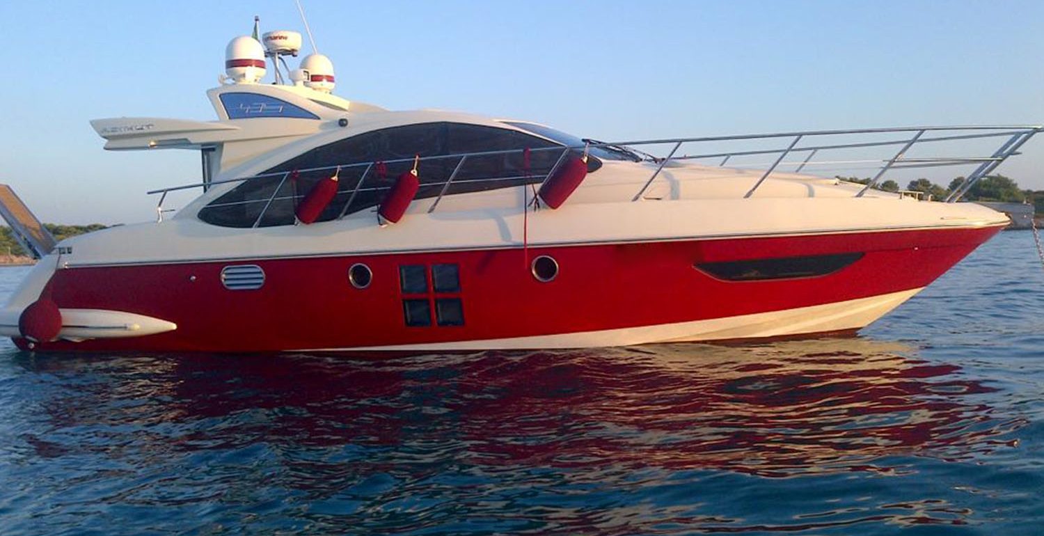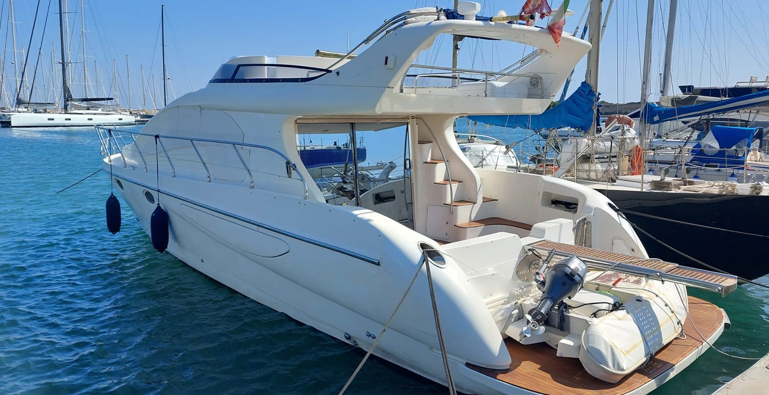 Splendida navetta dei cantieri sorrentini Aprea .Condizioni eccellenti, pronta alla boa con consegna immediata. La tuga è fornita di ampie vetrate che si aprono verticalmente ed il ponte principale ospita a prua un comodo prendisole, mentre il flybridge accoglie un secondo prendisole ed un angolo dinette, con divano e tavolo. L’accesso da poppa all’area interna avviene tramite una porta a vetri scorrevoli. La zona living si compone di un divano ad L sulla murata di dritta con un tavolo e di un altro divano lungo la murata di sinistra. La motorizzazione installata a bordo prevede due motori MAN mod. D 2876 LE 405 con trasmissione V-drive della potenza di 730 CV ciascuno, per una velocità massima di circa 30 nodi.